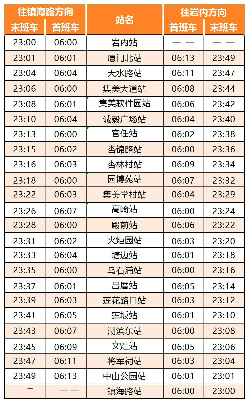 厦门地铁1号线首末班车时刻表